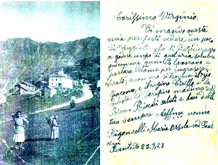 This is a picture of our great-grandmother Maria (center) and Uncle Giacomo (far right). This same view of Piantedo can be seen today and very little has changed except for the dress of the people.